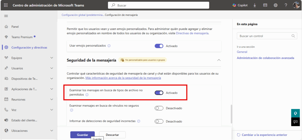 Una vez ahí, debemos buscar el apartado de “Seguridad de la mensajería” y veremos el control de configuración “Examinar los mensajes en busca de tipos de archivo no permitidos”. Lo activamos y luego guardamos los cambios. Con eso será suficiente para que Microsoft Teams empiece a bloquear los archivos peligrosos.