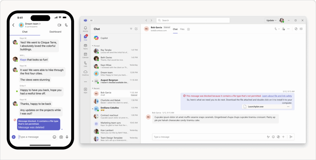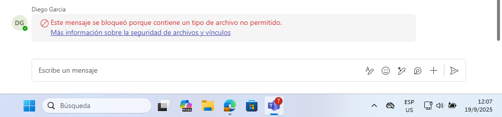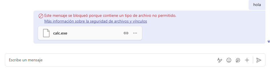 La experiencia del usuario que envia un mensaje con un archivo peligroso, Microsoft Teams bloqueará el mensaje completo, pudiendo ver un mensaje acerca del bloqueo. Tambien indicará porque se bloqueó y podrá editar el mensaje para eliminar el archivo y enviar de nuevo mensaje pero sin el archivo.
