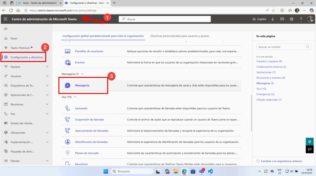 Para cambiar la configuración debemos ir al Admin Center de Microsoft Teams (https://admin.teams.microsoft.com/) luego en “Configuración y Directivas” y luego buscar dentro de la Configuración Global, la opción de Mensajería.